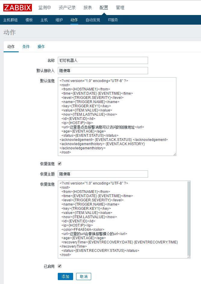 <?xml version="1.0" encoding="UTF-8" ?><root> <from>{HOSTNAME1}</from> <time>{EVENT.DATE} {EVENT.TIME}</time> <level>{TRIGGER.SEVERITY}</level> <name>{TRIGGER.NAME}</name> <key>{TRIGGER.KEY1}</key> <value>{ITEM.VALUE}</value> <now>{ITEM.LASTVALUE}</now> <id>{EVENT.ID}</id> <ip>{HOST.IP}</ip> <url>这里是点击报警消息可以访问的链接地址</url> <age>{EVENT.AGE}</age> <status>{EVENT.STATUS}</status><acknowledgement> {EVENT.ACK.STATUS} </acknowledgement><acknowledgementhistory> {EVENT.ACK.HISTORY}</acknowledgementhistory></root>